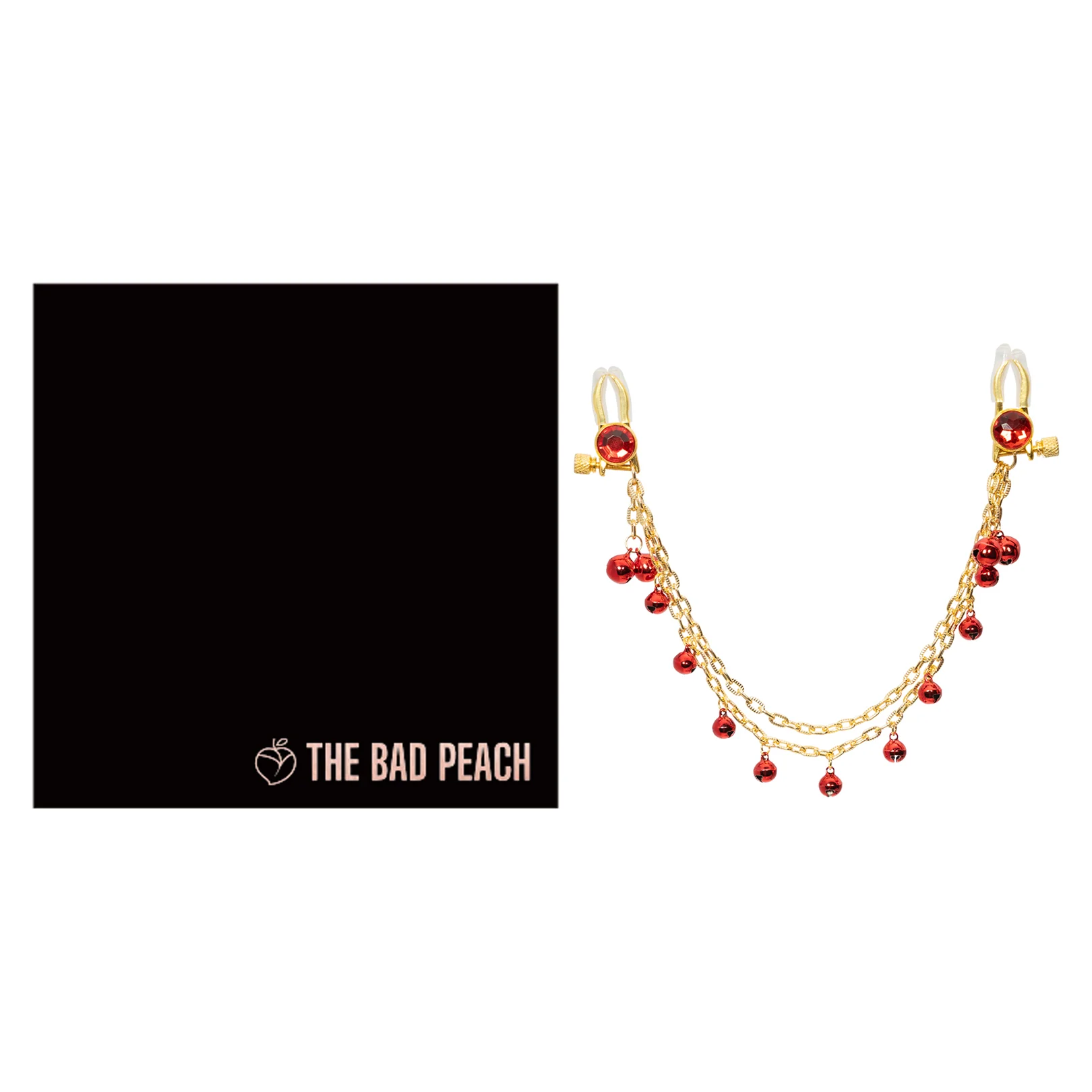 Gold-tone clamps, sparkling red gems, and chains with melodic bells. Adjustable screws ensure secure tension. Indulge in exquisite sensations.